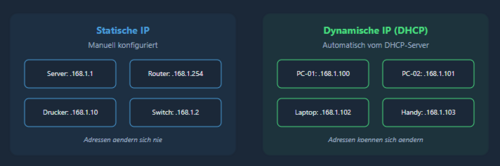 - Infrastruktur-Geraete (Server, Router, Drucker, Switches) erhalten statische IPs - sie muessen zuverlaessig erreichbar sein.