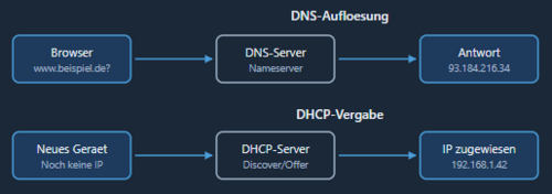 Themen: DORA-Prozess, DNS-Hierarchie, Zusammenspiel beider Dienste, Fehlersuche.
